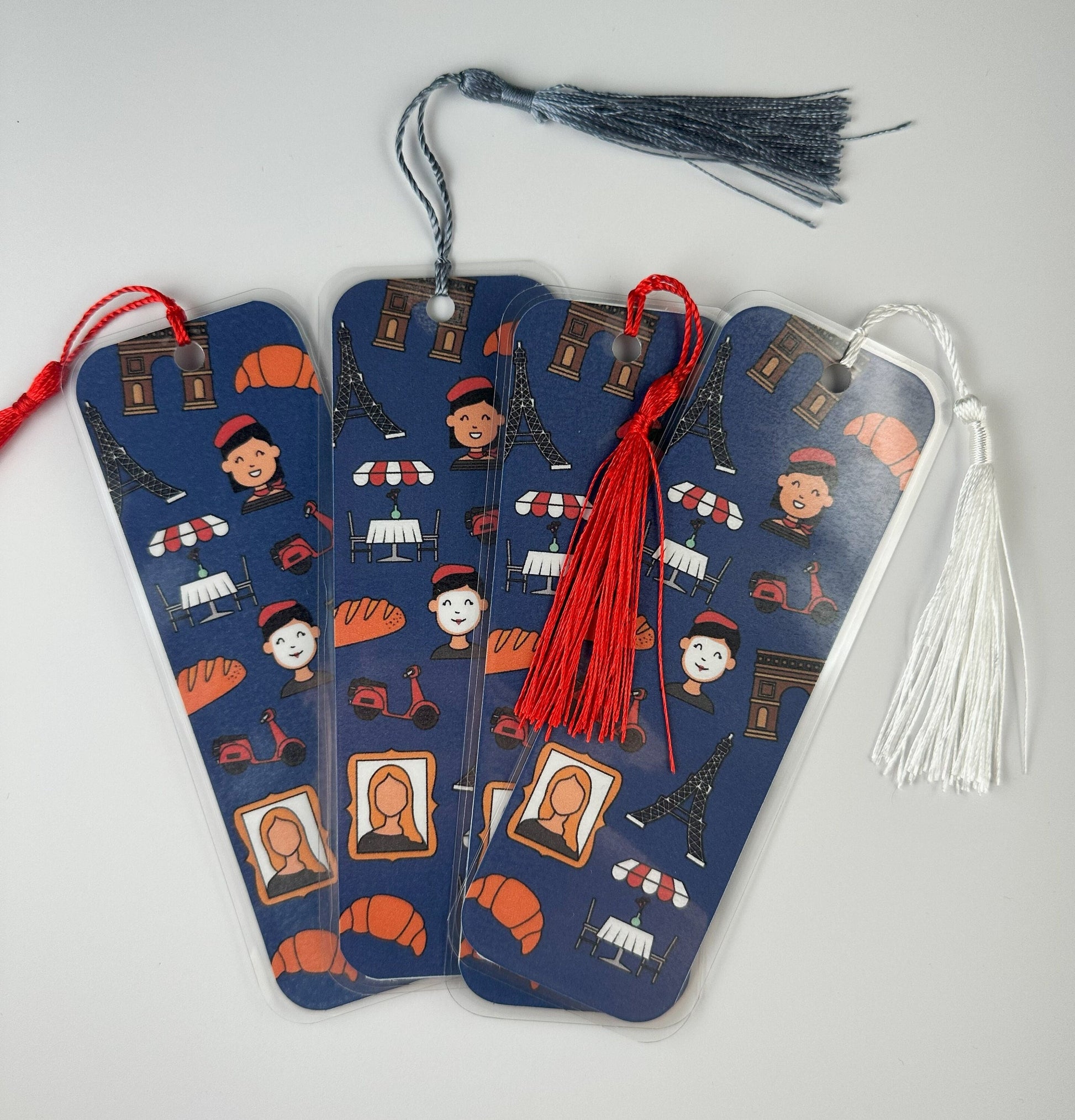 Introducing our enchanting Parisian Bookmark - the perfect accessory to infuse a touch of Parisian charm and elegance into your reading escapades! This delightful bookmark showcases iconic Parisian designs, such as the Eiffel Tower, Arc de Triomphe, Croissants, and a café, evoking the magic of the City of Light with every page you turn.