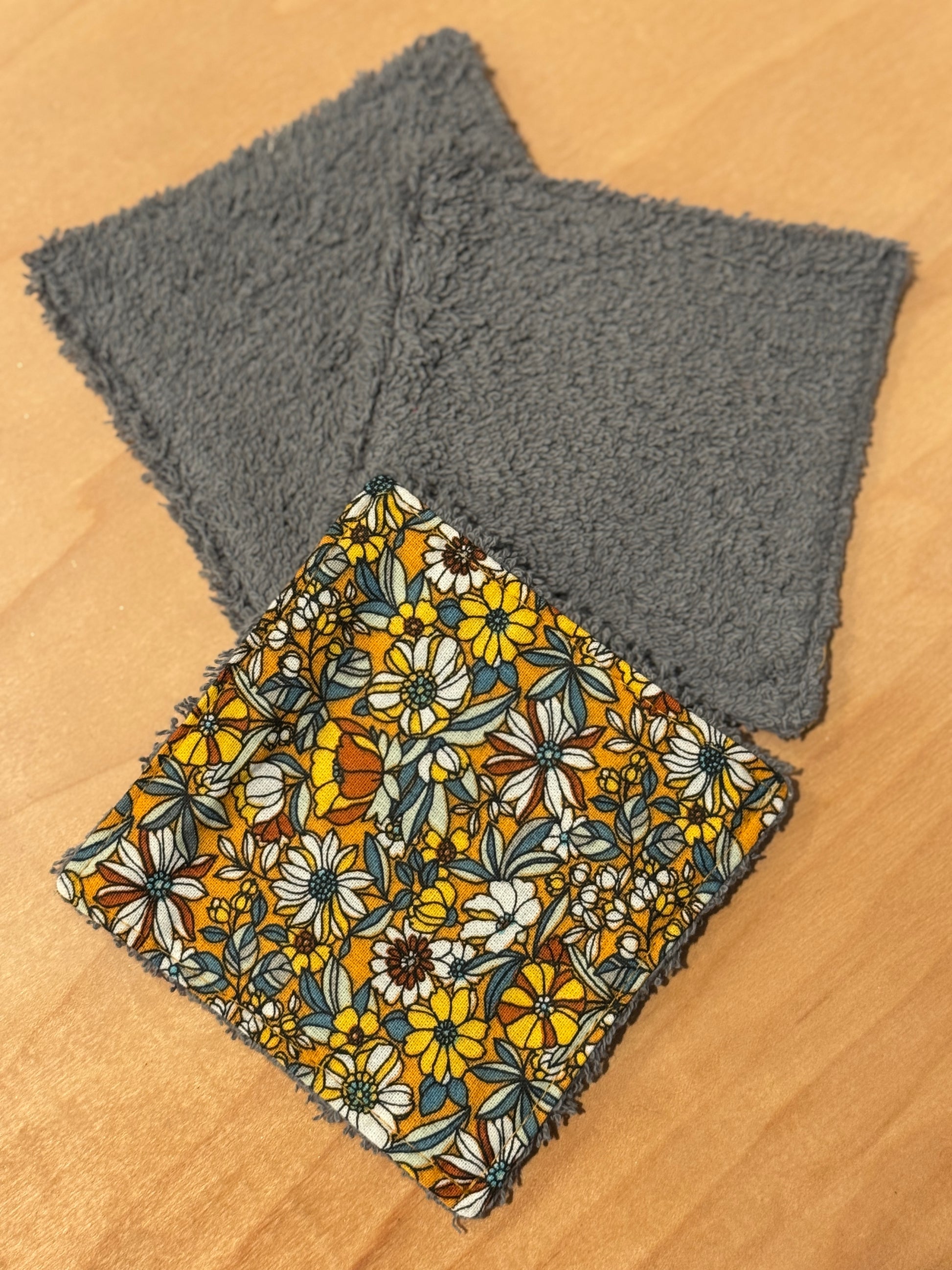 These zero-waste, sustainable cosmetic squares are made with soft organic cotton terry on one side, and a patterned cotton fabric on the other. These pads are great for removing makeup or applying toner.